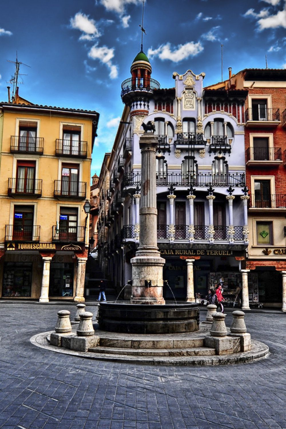 Llegados a la plaza del Torico, aunque su nombre oficial es el de plaza de Carlos Castel, nos llama la atención la fuente que preside el centro de la plaza y que lleva en su base una inscripción que nos habla del año de fundación de la cuidad por parte de Alfonso II. Si levantamos la vista hacia el final de la fuente vemos uno de los principales símbolos de la ciudad, El Torico. Este pequeño toro hace referencia a la leyenda de la fundación de la cuidad de Teruel por parte de las tropas del rey de Aragón en 1161. Alfonso II ve en lo alto de la muela sobre la que se levanta Teruel un toro y sobre él brilla una estrella, este hecho es considerado como una señal divina para que él funde en ese lugar una nueva villa cristiana. Cuando se construye la fuente es mediados del siglo XIX, época del romanticismo y existe una añoranza por la Edad Media, cuando se funda Teruel. Se desconoce quien fue el autor de la fuente, pero quien la diseñara cuando colocó ahí el Torico lo hizo recordando el origen fundacional de la ciudad. Hoy en día, esta fuente se ha convertido en un atractivo turístico ya que nadie se ve de Teruel sin ver ni fotografiar su Torico. También en esta plaza de Carlos Castel se encuentran las principales casas modernistas proyectadas por Pau Monguió como es la casa Ferrán, la de la Madrileña o la casa del torico. En todas cabe destacar el trabajo de la forja realizada por Matías Abad, los diseños en estuco, los motivos vegetales y sus aleros de madera.