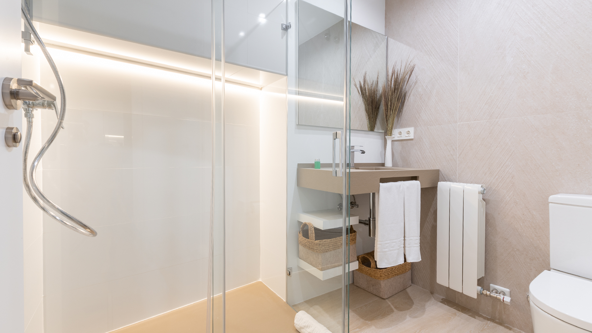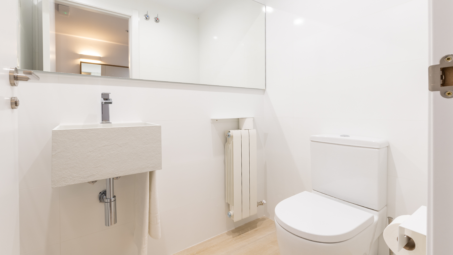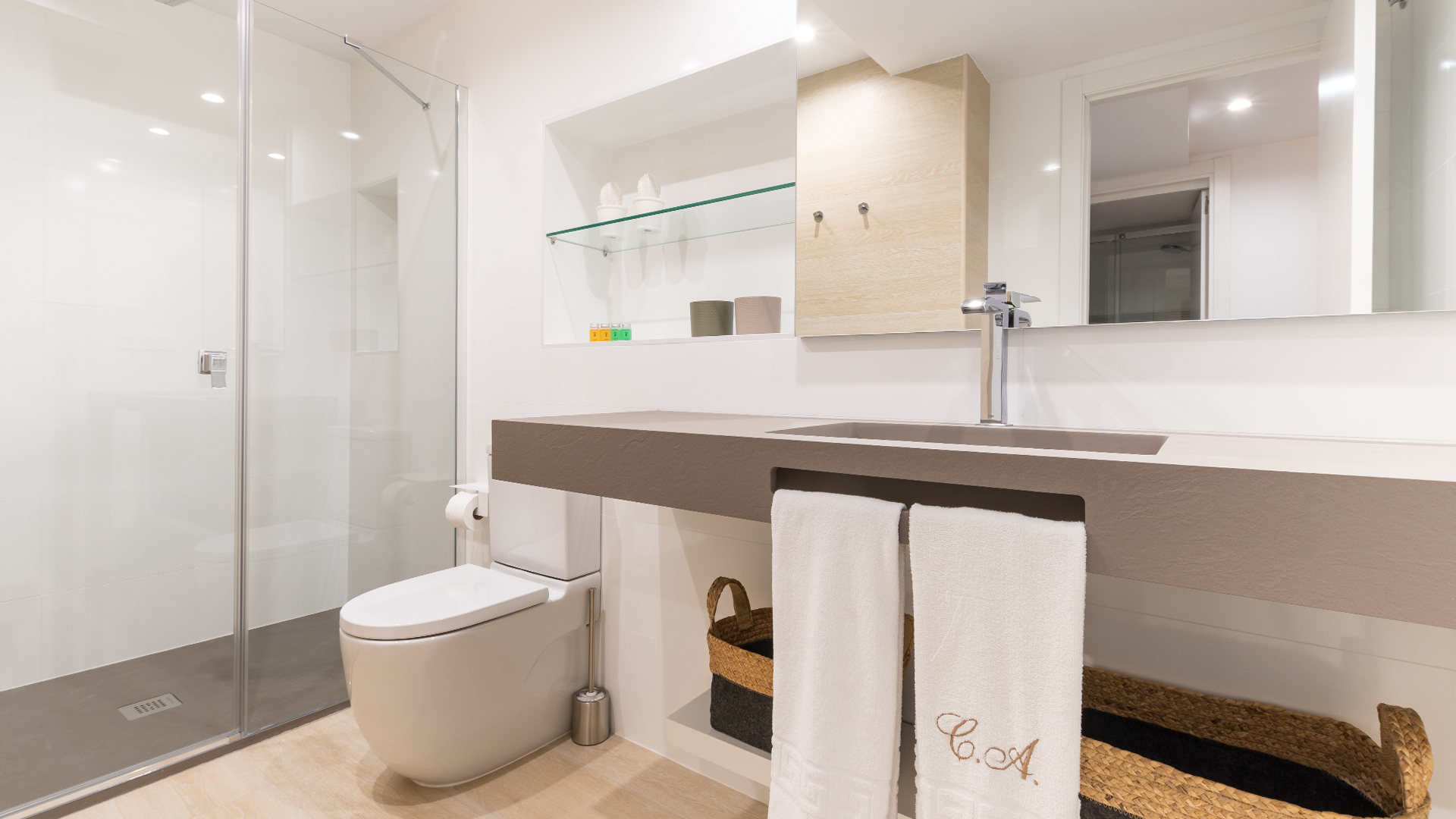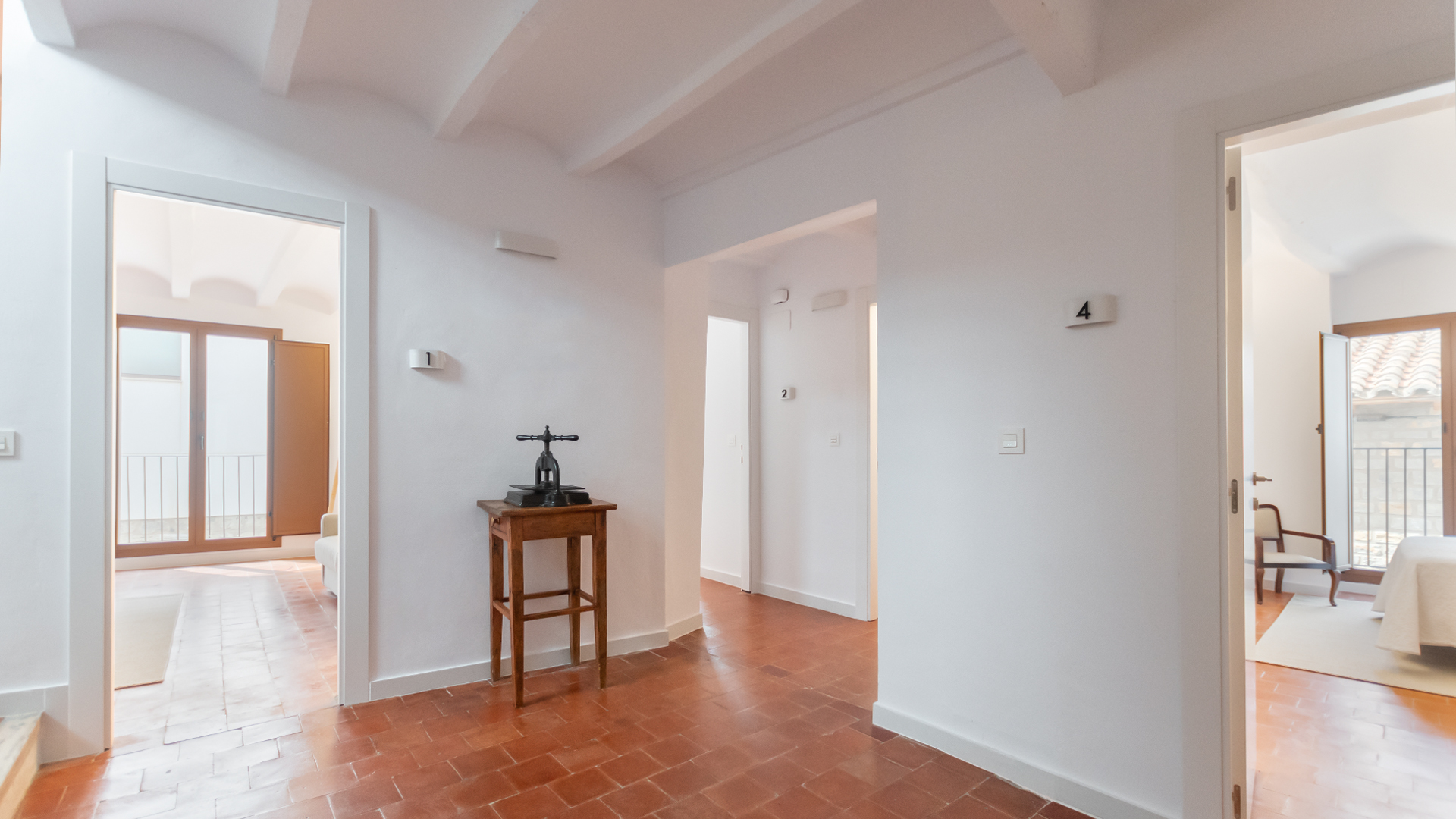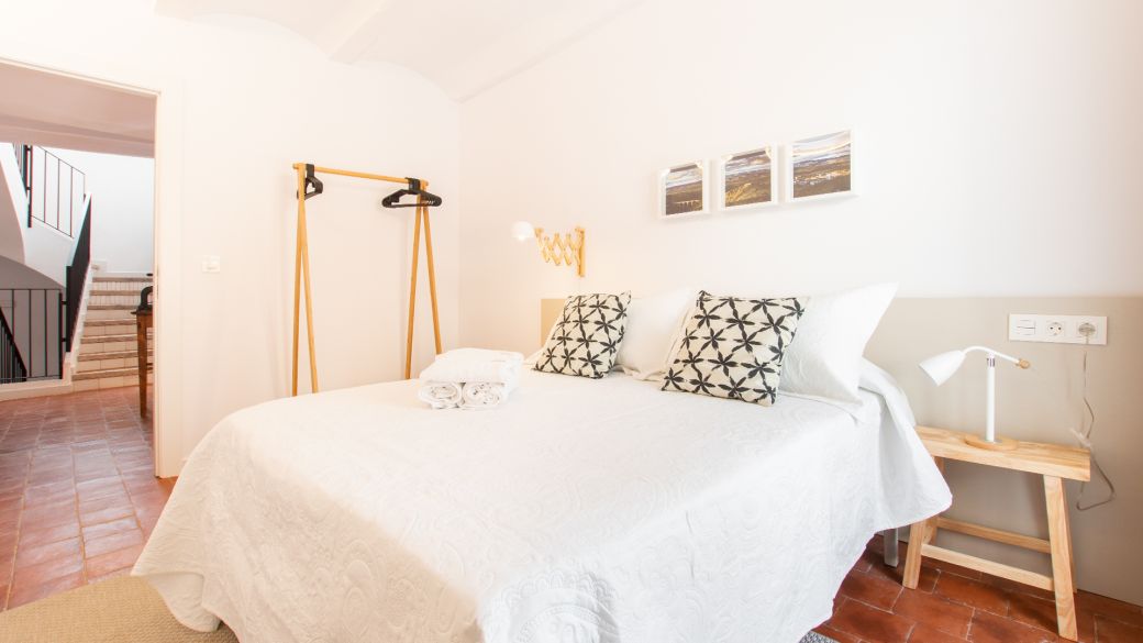 Y en la primera planta se localizan 4 habitaciones de matrimonio, decoradas con blancos y maderas naturales. Todas ellas cuentan con ventanales al exterior de las calles de Albentosa. En cualquiera de ellas se puede poner cama supletoria. Y, además, hay un baño completo, también totalmente equipado.